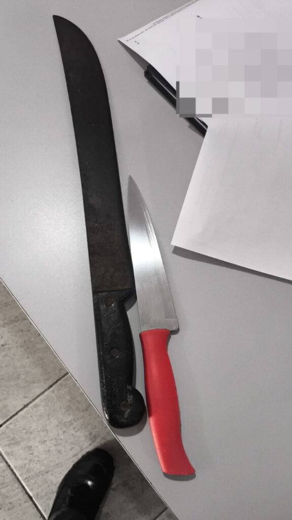 Durante a intervenção policial, o indivíduo foi localizado de posse de um facão com lâmina superior a 30 centímetros e uma faca de açougue com aproximadamente 25 centímetros, ambos apreendidos pela autoridade policial. Após a contenção dos ânimos, a vítima relatou que o autor havia passado a noite fazendo uso de drogas e anabolizantes, além de tê-la ameaçado.
